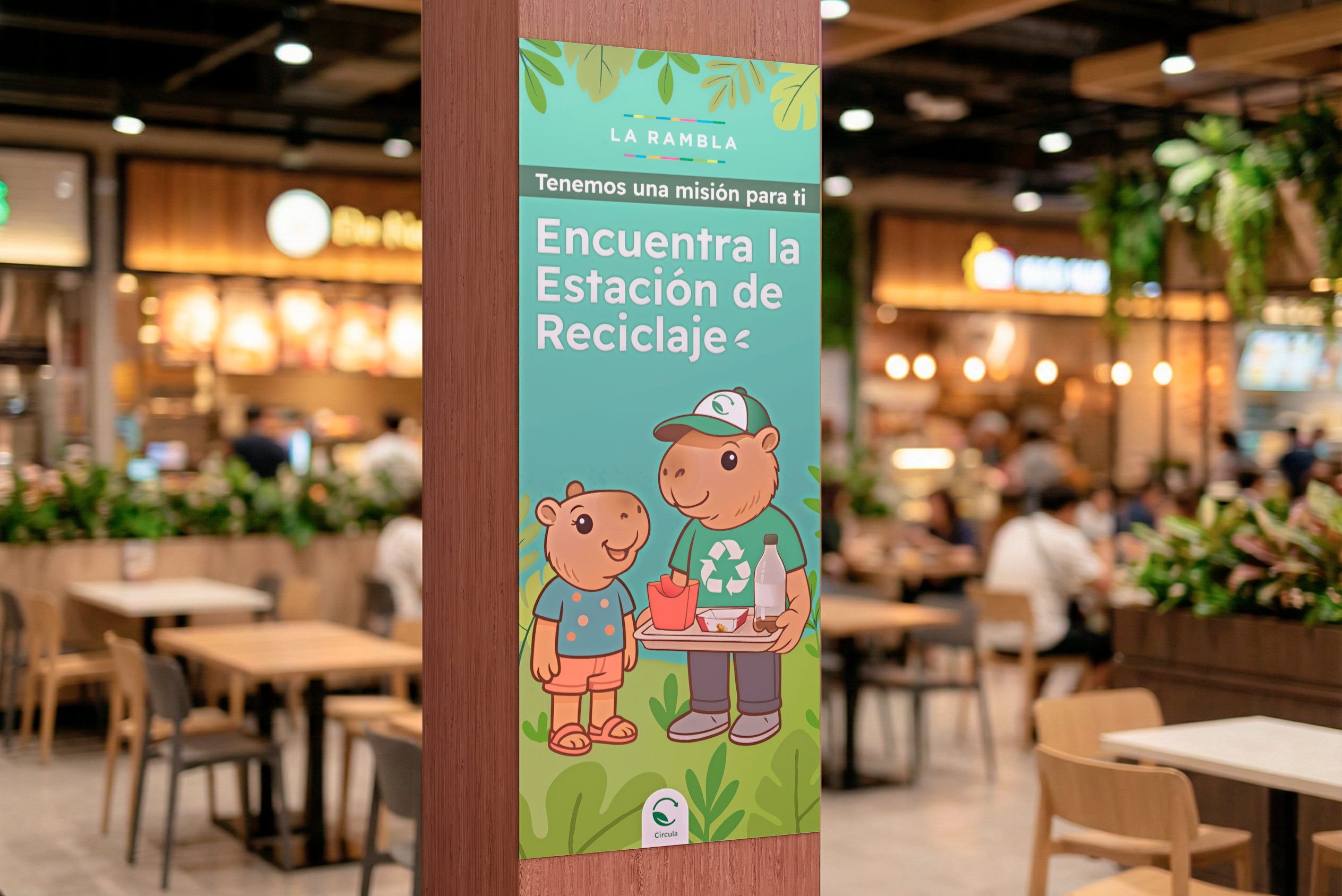 El proyecto implementa un sistema de reciclaje en La Rambla. Utiliza ilustraciones atractivas para atraer a niños y adultos, con señaléticas que guían hacia la responsabilidad social.