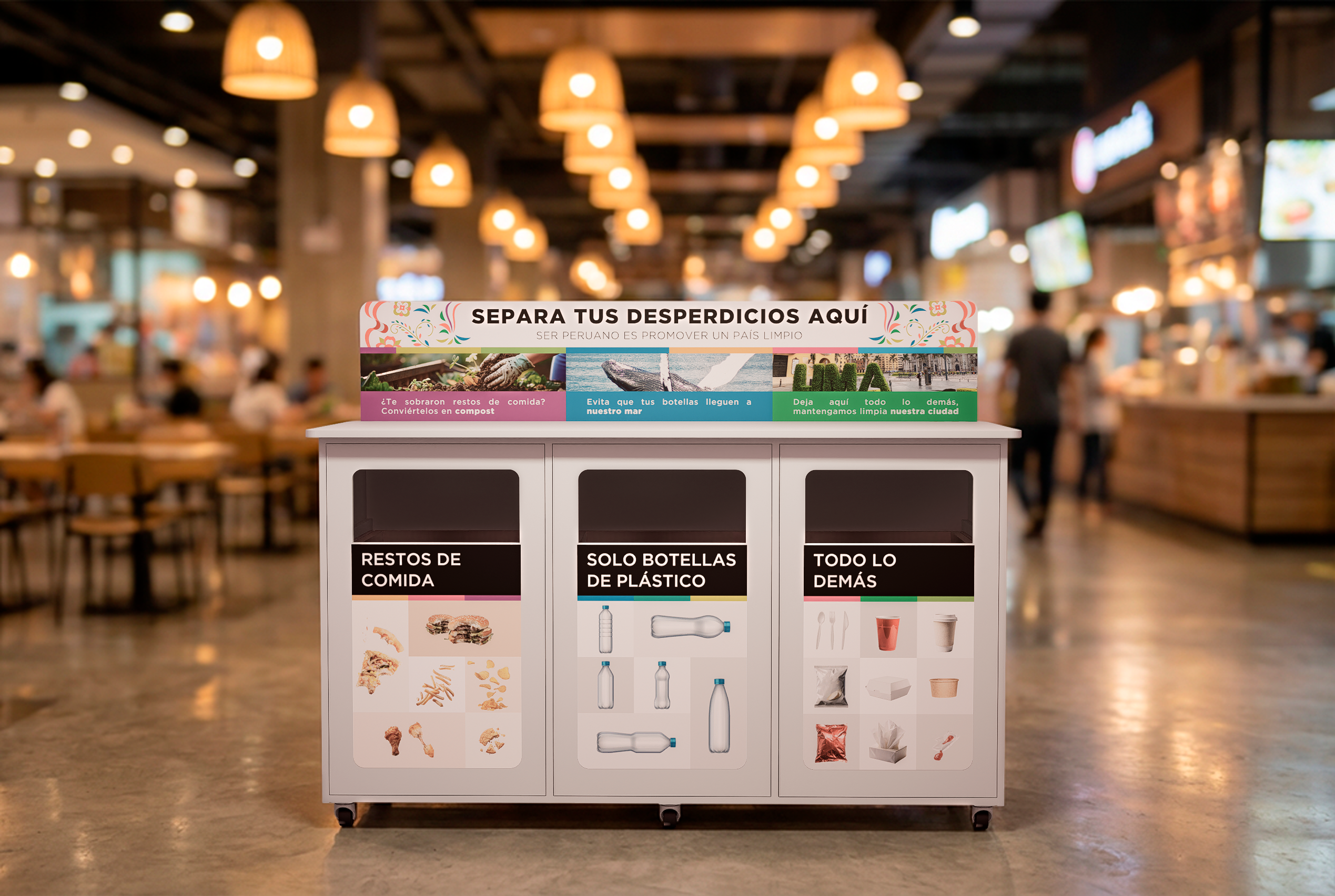 Mueble multifuncional para residuos. Incluye gráficos innovadores para educar sobre reciclaje, promoviendo sostenibilidad y mejorando la experiencia del usuario.