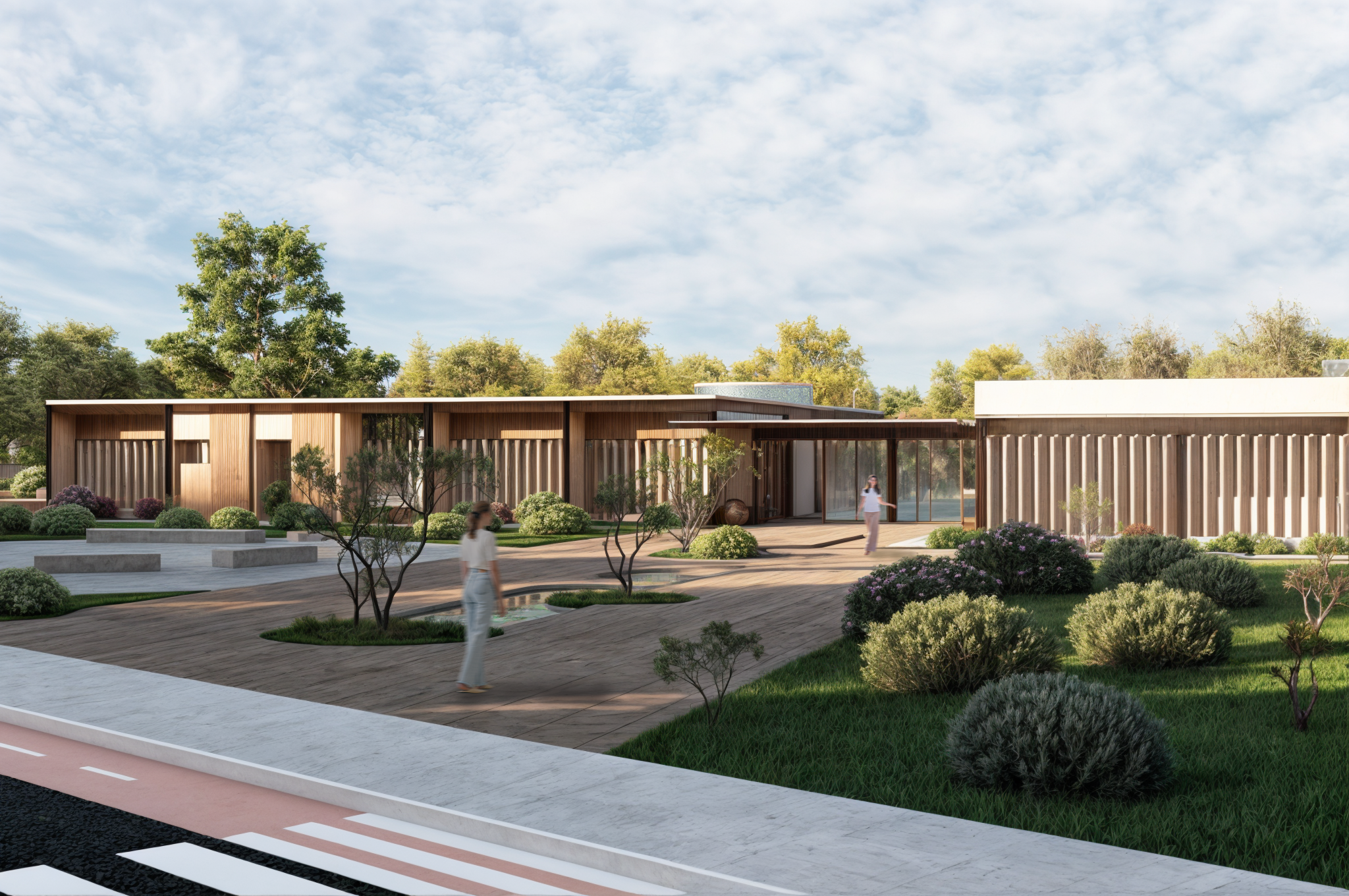 El Centro de Bienestar Psicosocial en Pachacamac, como PFC, promueve la salud mental y el bienestar emocional, integrando áreas verdes y funcionalidad para la relajación.