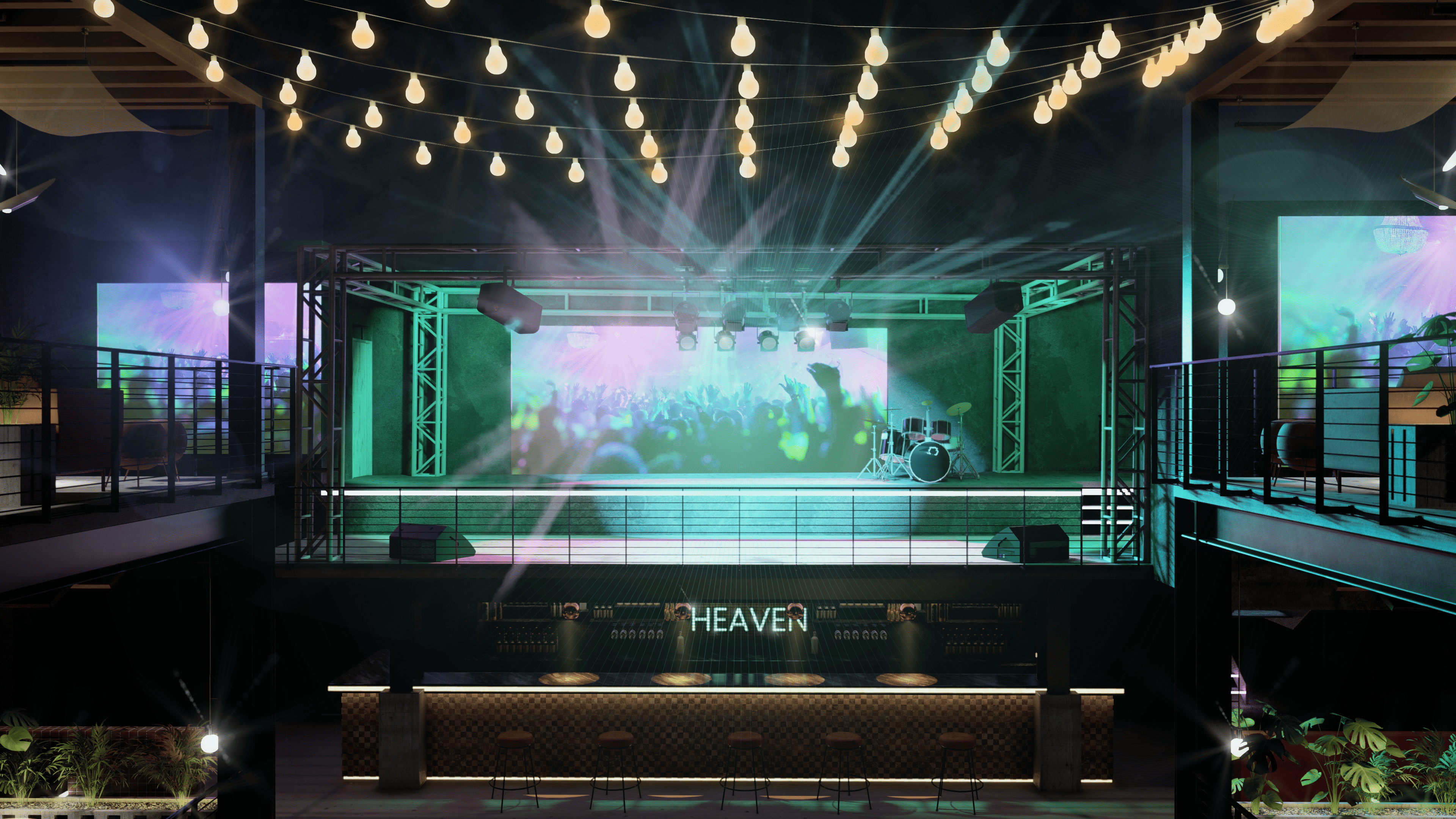 Club Heaven es una discoteca cuya estructura metálica destaca en el desierto, creando un ambiente acogedor y vibrante.